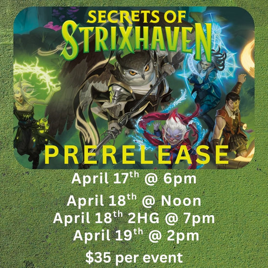 Secrets of Strixhaven prereleases are in session this weekend! Entry is $35 per event, and will include a prelease kit and booster pack prizes!